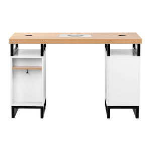 The combination of a top in wood tones with white fronts and black frame elements and handles creates a modern yet professional look. The contrast between the white cabinets, the wooden top and the black metal frame gives the desk a sleek, contemporary feel. The stable metal base ensures durability and comfort, even when working for hours. It is an excellent choice for both smaller living rooms and spacious offices with modern decor.