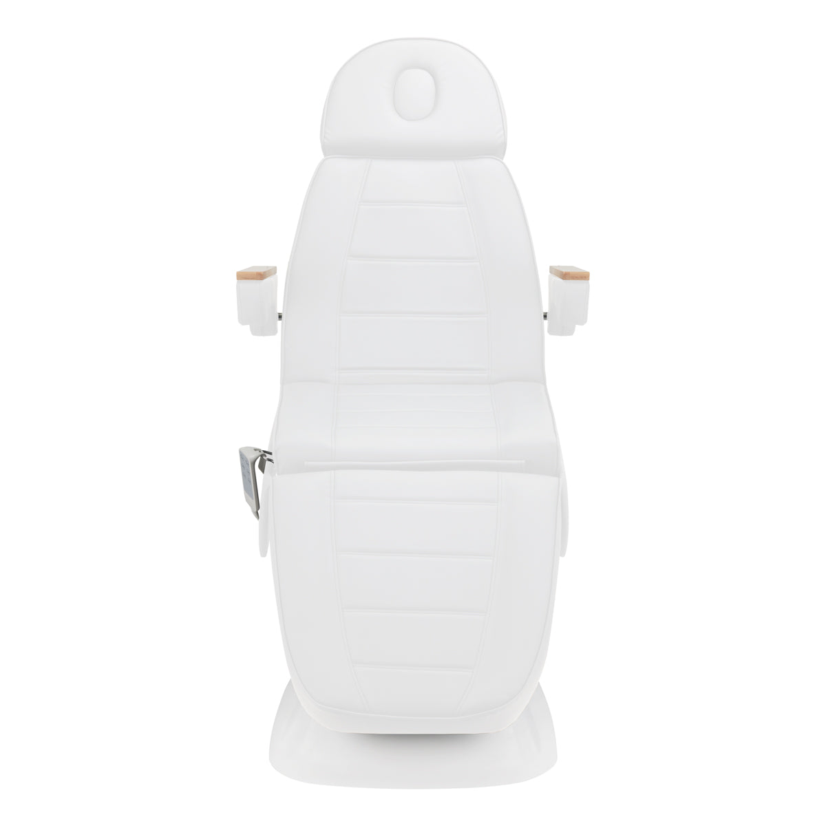 The chair is filled with foam of appropriate hardness and covered with pleasant-to-the-touch imitation leather in shades of white. Thanks to the use of a material that is easy to keep clean and resistant to selected disinfectants, the equipment is comfortable to use, resistant to moisture and easy to clean. A solid base made of durable material in shades of whiteensures stability during treatments. Decorative wooden elements on the armrests distinguish the chair from other models, being a visually appealing, elegant accent. Properly profiled hems give the chair a stylish look and make the seat ergonomic.