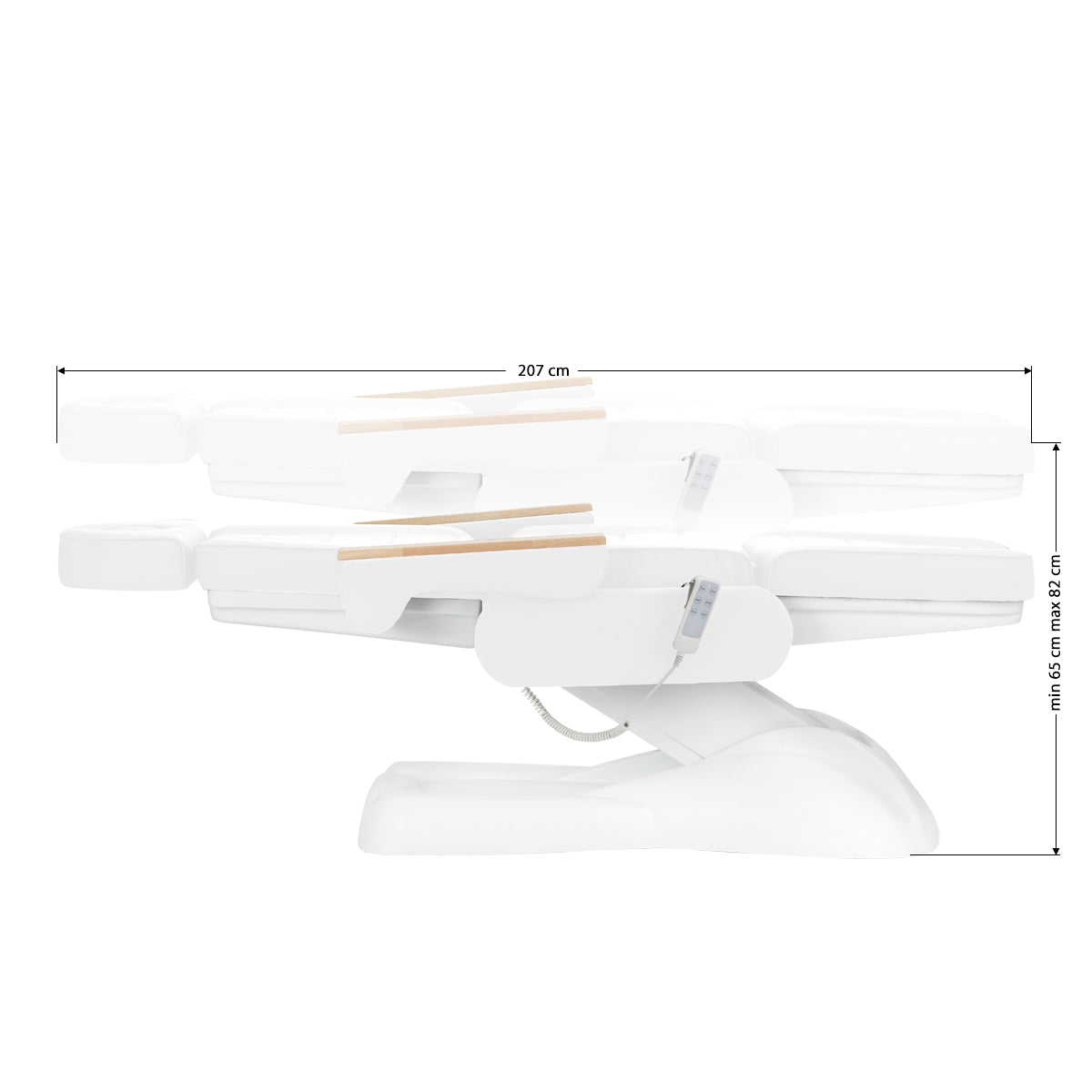 The height of the seat is adjustable from 60 cm to 80 cm (± 3 cm), and when fully extended the chair reaches a length of over 2 meters. These dimensions allow the equipment to be easily used by people of different heights and make it adaptable to the needs of both the client and the person performing the procedure. On the right side of the seat a special metal holder for hanging the remote control has been installed, which greatly facilitates its storage and makes it always at hand.