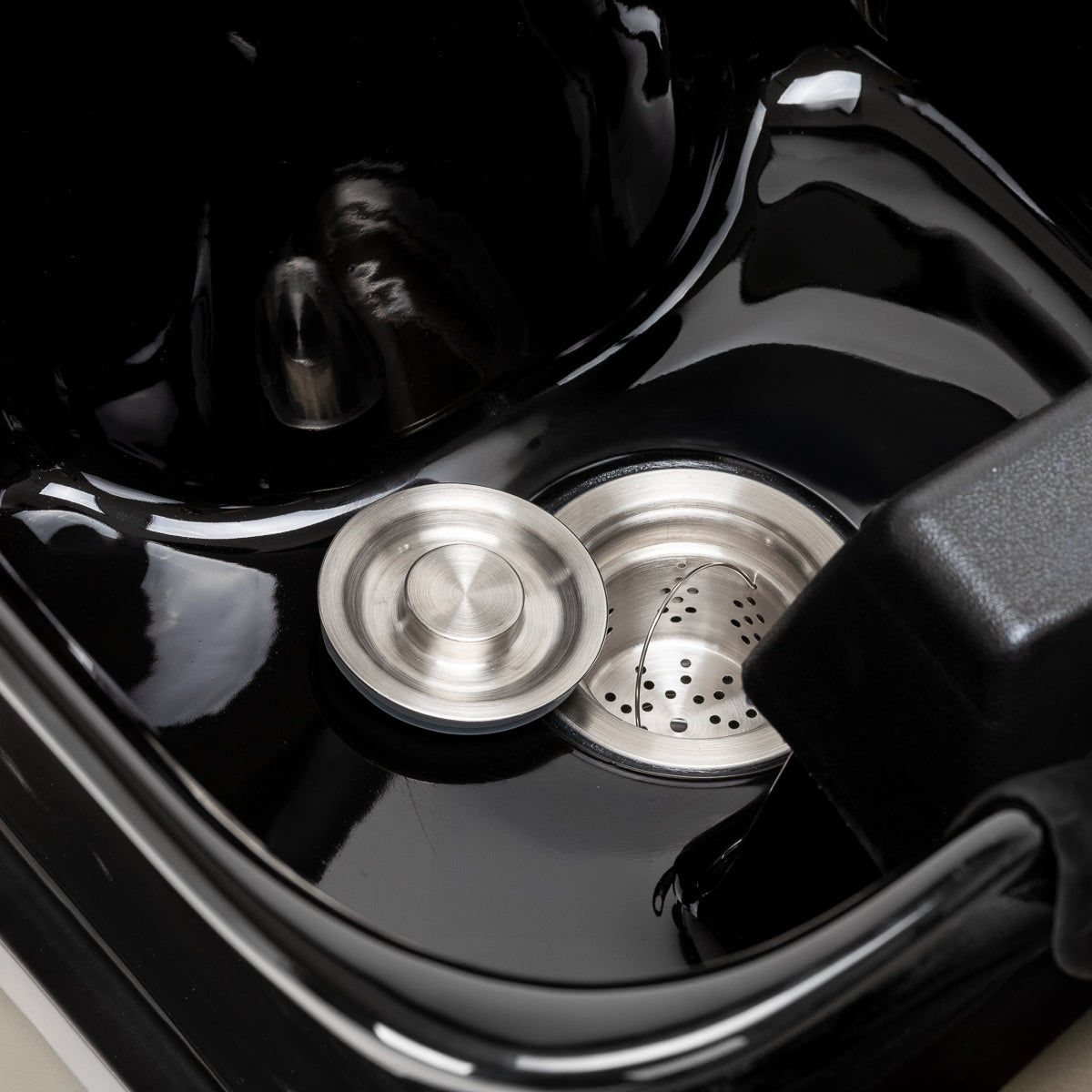 The ceramic bowl in shades of black, with its modern shape and appropriate depth, effectively prevents splashing of water and products used during treatments, allowing for comfortable and effective performance of a wide range of services. The properly profiled collar and angled backrest provide comfort and support during hair washing, while the black plastic cover protects the client from the cold ceramic surface, ensuring a pleasant experience during the treatment.