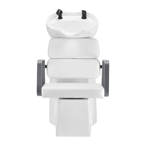 The profiled chair provides adequate lumbar support and, therefore, high comfort of use. Metal armrests in shades of gry with a geometric shape allow for the correct positioning of the customer's shoulders. Filling with durable, deformation-resistant foam and upholstery made of pleasant-to-touch synthetic leather in shades of white ensure the durability of the furniture, ease of cleaning and comfortable use for a long time. The original, elegant appearance of the hair wash unit gives the interior a unique expression. The set includes complete fittings in shades of black, including a faucet, a shower head and dedicated hoses to provide a complete set of tools for work.