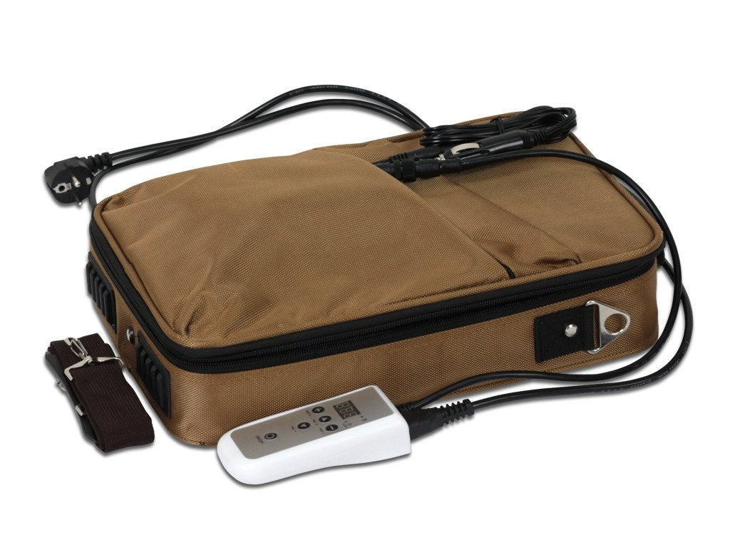 Portable stone heating bag, powered by mains and car socket.