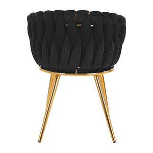 De aangenaam aanvoelende, fluwelen bekleding in zwarte tinten geeft de stoel een uniek karakter, en het esthetisch gevlochten materiaal op de rugleuning benadrukt het unieke uiterlijk van het meubel. Dit geeft het een exclusieve uitstraling en zorgt voor comfortabel gebruik. Het frame in gouden tinten voegt elegantie en prestige toe en past perfect bij het fluweel. De elegante 4Rico stoel is een uitzonderlijk comfortabel meubel dat een decoratie zal zijn voor de receptie van elke schoonheidssalon.
