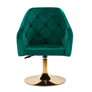 Het interessante ontwerp geeft de stoel een uniek karakter. De aangenaam aanvoelende, fluweelzachte bekleding in groene tinten, samen met de decoratieve stiksels, maken het een sieraad voor elk interieur. De stabiele, ronde basis in gouden tinten voegt elegantie toe en past perfect bij het fluweel. De esthetische afwerking, comfortabel geplaatste armleuningen, ergonomisch gevormde rugleuning en esthetische stiksels zorgen ervoor dat de stoel voldoet aan de eisen van zelfs de meest veeleisende gebruikers.