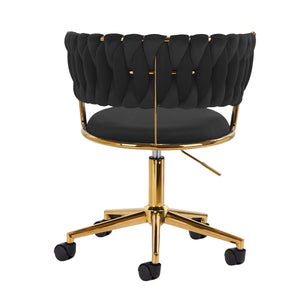 De afwerking zorgt ervoor dat het meubel in het oog springt. De aangenaam aanvoelende, fluweelzachte bekleding in zwarte tinten geeft het een uniek karakter. De gouden basis voegt elegantie toe en past perfect bij het fluweel. De functionele wielen zorgen voor mobiliteit, waardoor de stoel gemakkelijk te verplaatsen is en je je tijdens het werk door de salon kunt bewegen. De zorgvuldige afwerking, het comfort en het esthetisch gevlochten materiaal op de geprofileerde rugleuning zorgen ervoor dat de stoel zelfs aan de eisen van de meest veeleisende gebruikers voldoet.