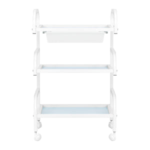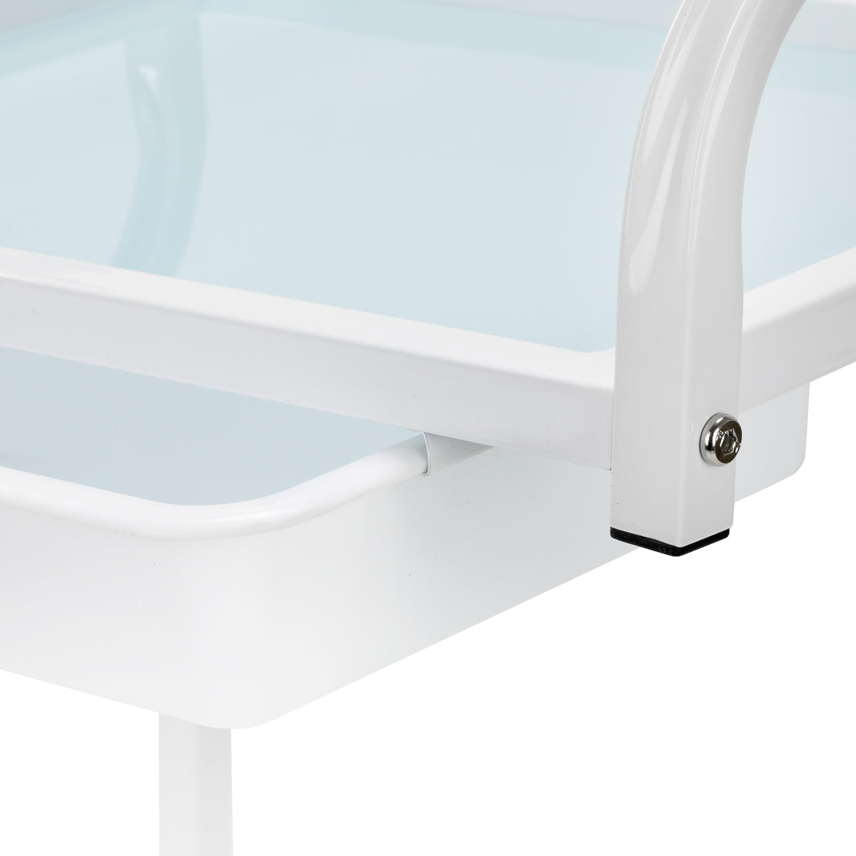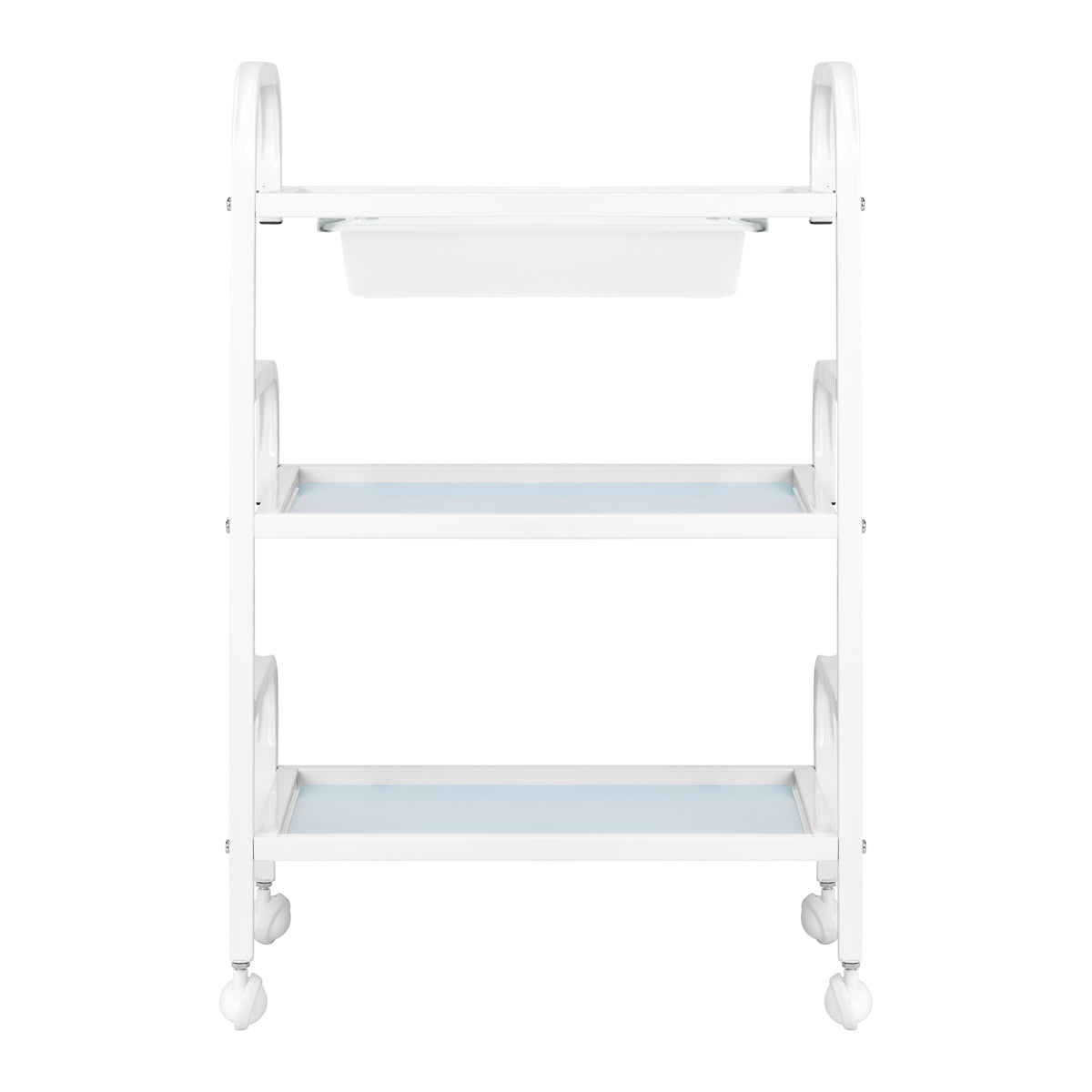Cosmetische helper Basic 121 is een functioneel meubelstuk dat perfect is voor elke schoonheidssalon of SPA. De lichtgewicht constructie vergemakkelijkt het dagelijkse werk en de drie glazen planken bieden een handige opslag van cosmetica, accessoires en apparatuur. De extra bak onder de bovenste plank biedt snelle toegang tot de meest gebruikte gereedschappen. Het minimalistische ontwerp geeft het interieur een professioneel karakter.
