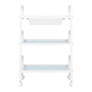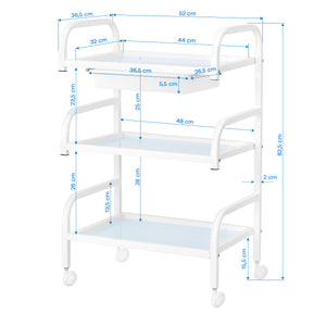 Het frame van duurzaam aluminium in wittinten en de glazen planken vormen een modern en esthetisch geheel dat gemakkelijk schoon te houden is. De vier wielen zorgen voor mobiliteit, wat de organisatie van de werkruimte vergemakkelijkt, en de solide materialen garanderen stabiliteit en een lange levensduur.