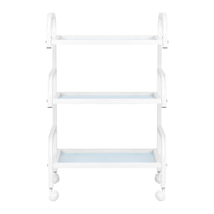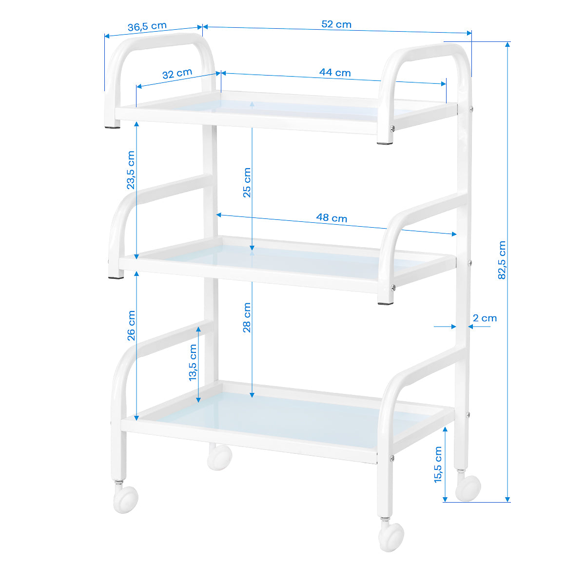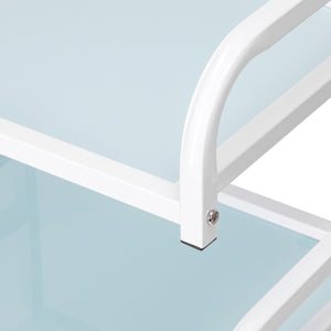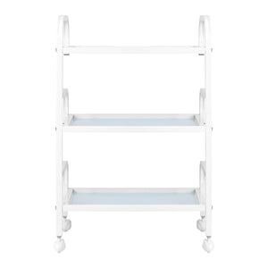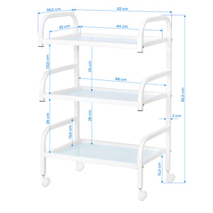 Het frame van duurzaam aluminium in wittinten en de glazen planken vormen een modern en esthetisch geheel dat gemakkelijk schoon te houden is. De vier wielen zorgen voor mobiliteit, wat de organisatie van de werkruimte vergemakkelijkt, en de solide materialen garanderen stabiliteit en duurzaamheid.
