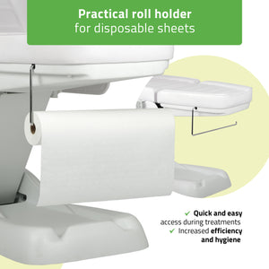 Rolpapierhouder: De stoel is voorzien van een praktische houder voor wegwerprolpapier, wat de efficiëntie en hygiëne tijdens behandelingen verhoogt.