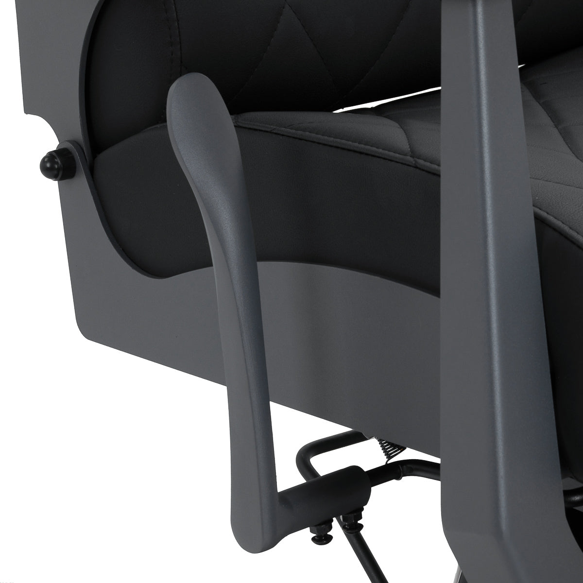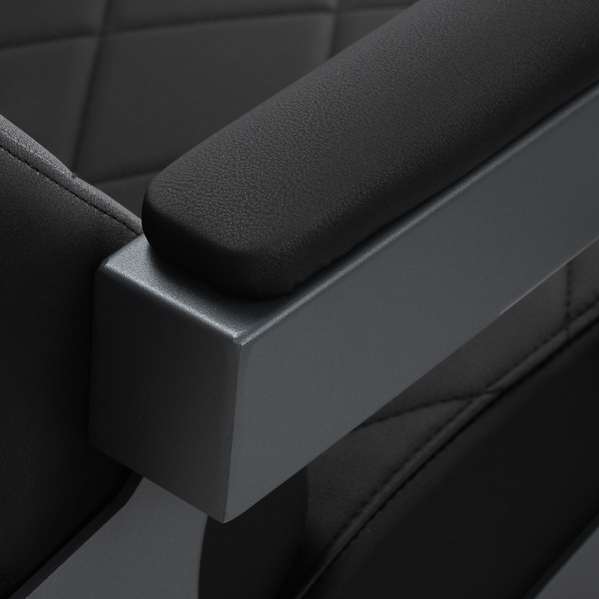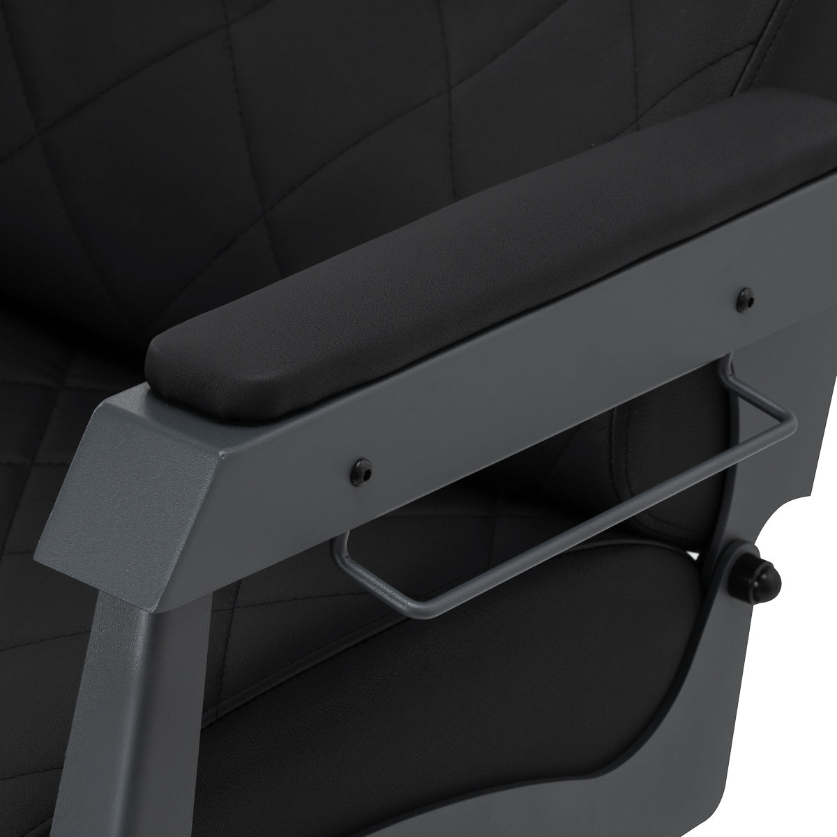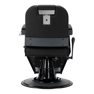De stabiele constructie zorgt voor veiligheid en langdurige duurzaamheid. De zitting, gevuld met vervormingsbestendig schuim, en de bekleding van zacht, synthetisch leer zorgen voor duurzaamheid en comfort. De vochtbestendige materialen zijn niet alleen duurzaam, maar ook gemakkelijk schoon te maken. De zwarte bekleding in combinatie met een grafiet frame geeft de stoel een moderne en professionele uitstraling, terwijl de minimalistische stijl ervoor zorgt dat hij past in het decor van elke barbershop.