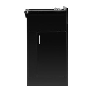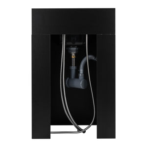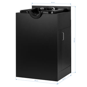 De behuizing heeft zijdeuren die gemakkelijke toegang tot de installatie bieden en het mogelijk maken om de meest noodzakelijke producten op een discrete manier op te bergen. De opening aan de achterkant voor de wateraansluiting zorgt voor een comfortabele en esthetische aansluiting van het station, terwijl het tegelijkertijd mogelijk is om leidingen en afvoeren te verbergen, wat bijdraagt aan het behoud van de orde en een professionele uitstraling van de werkplek. De compacte vorm van het meubel maakt het ideaal voor zowel grote salons als kleinere salons.