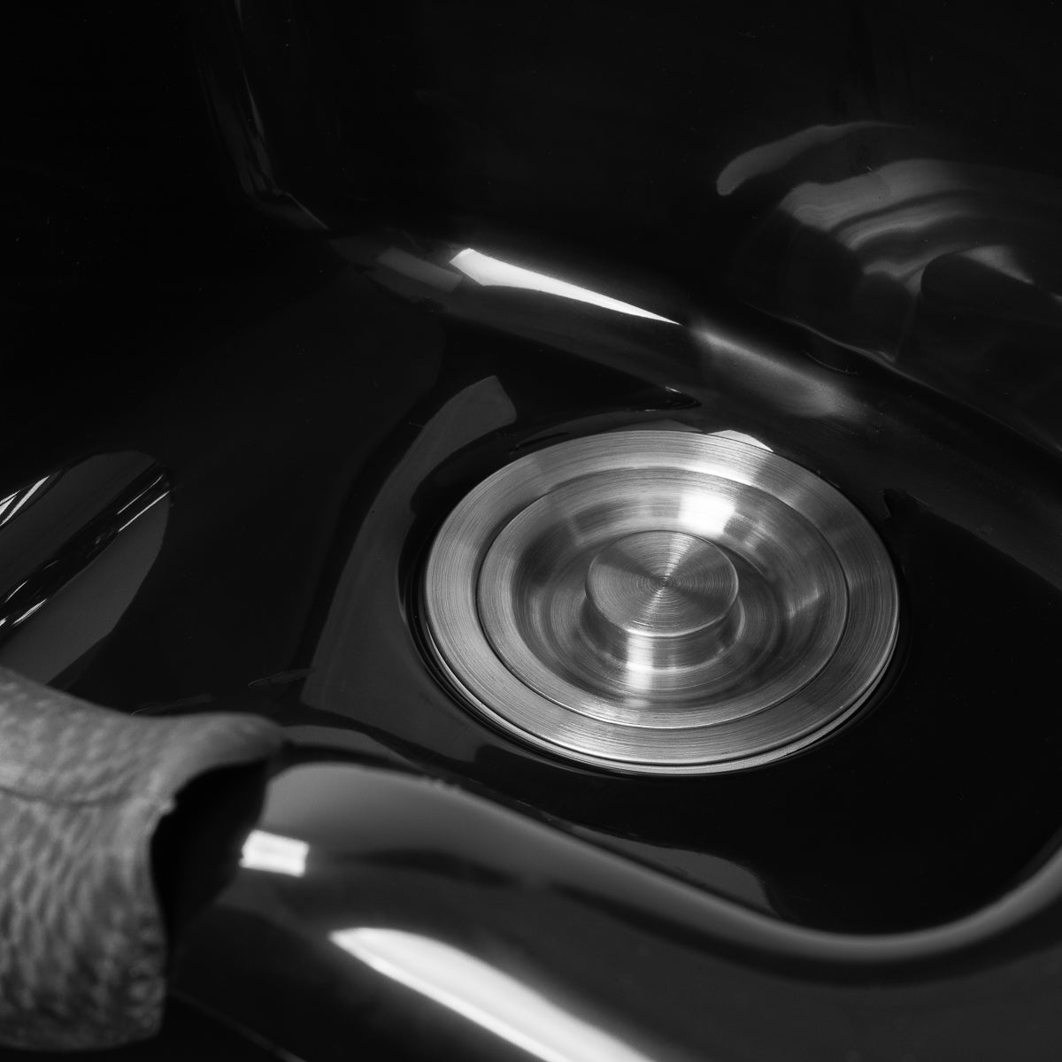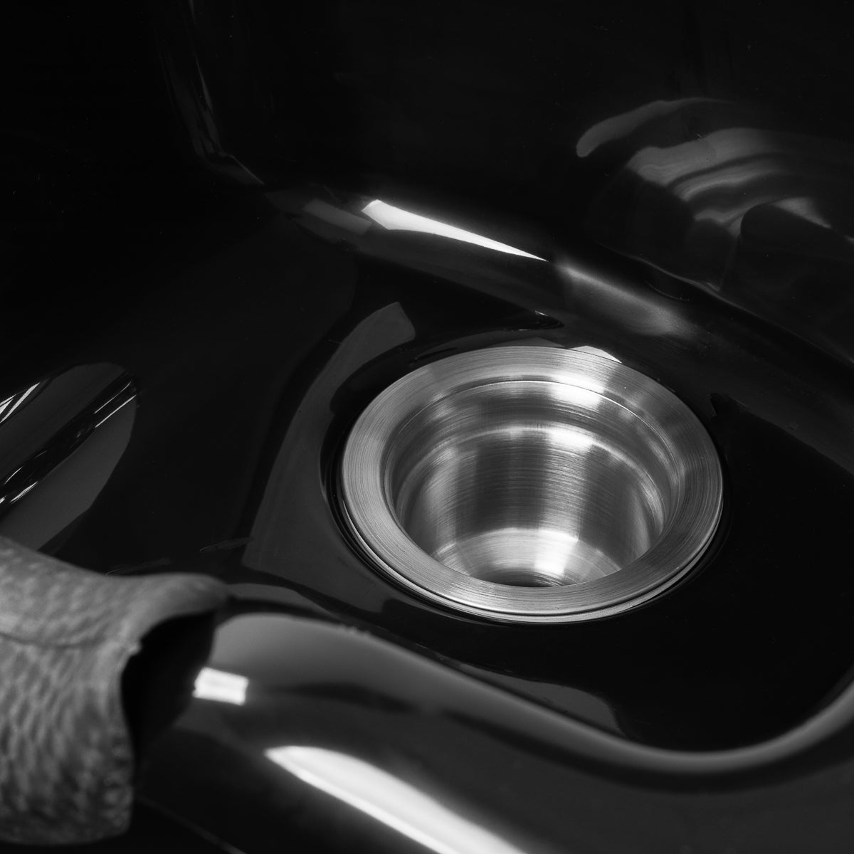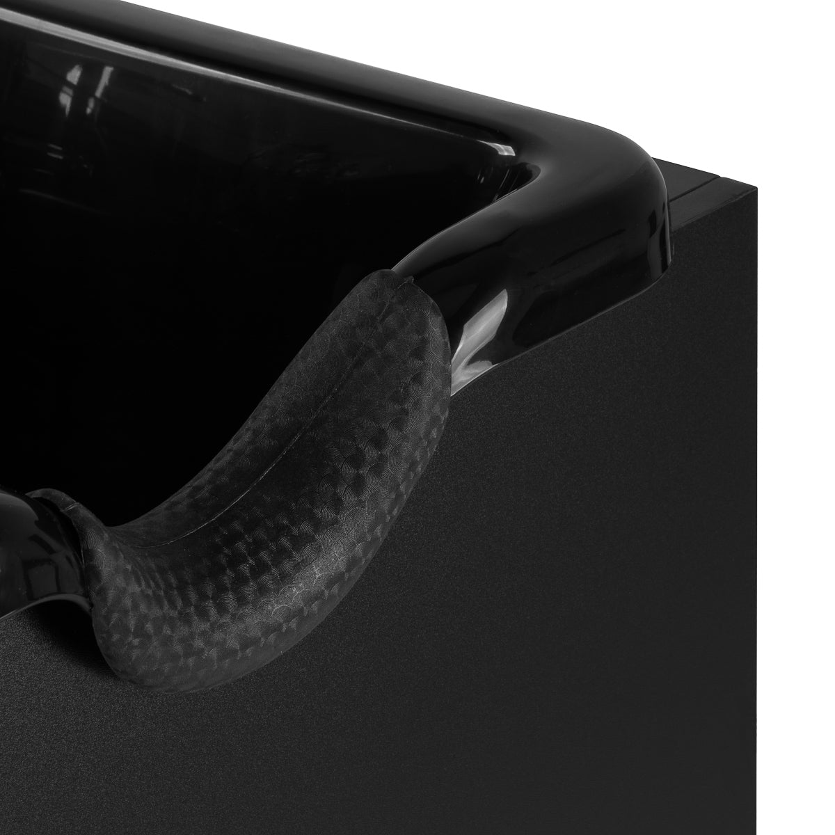 De diepe wasbak in zwart is gemaakt van duurzaam kunststof, waardoor deze bestand is tegen beschadiging en gemakkelijk schoon te maken. Het doordachte ontwerp beperkt effectief het spatten van water en preparaten tijdens het wassen. De ergonomische vorm en de voorgevormde kraag met siliconen pad zorgen ervoor dat de klant comfortabel zijn hoofd kan plaatsen. De praktische plek voor de douchekop bevordert een betere organisatie van de werkplek, en de stop met zeef maakt het gemakkelijk om de waterstroom te regelen en de netheid en hygiëne te handhaven.