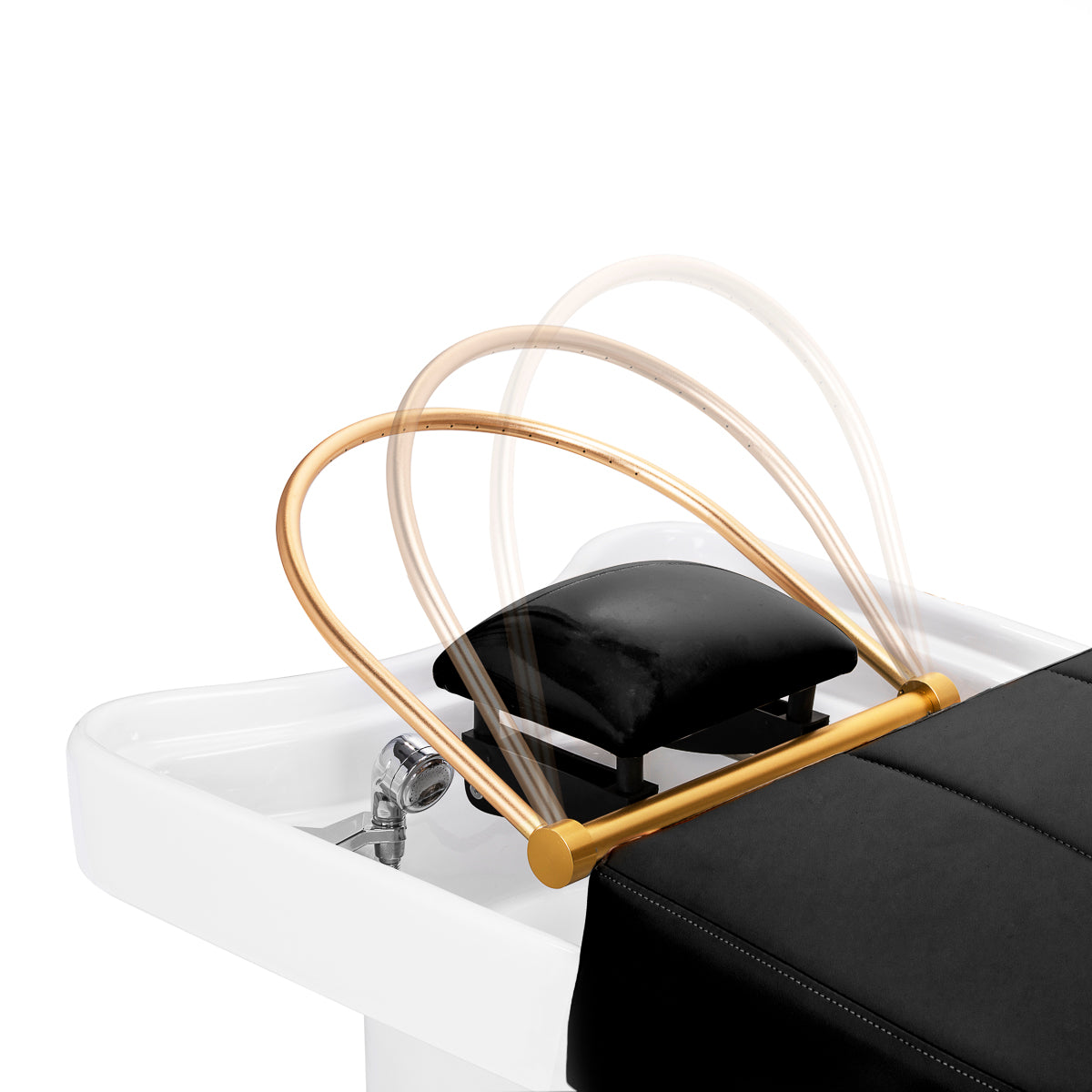 De diepe keramische kom in witte tinten voorkomt effectief het morsen van water en producten die tijdens de behandelingen worden gebruikt, waardoor de reinheid en het werkcomfort worden gegarandeerd. De unieke kromming vergemakkelijkt niet alleen de toegang voor de persoon die de dienst verleent, maar geeft de wasunit ook een elegant, modern karakter. De kom is gemaakt van duurzaam materiaal en is bestand tegen verkleuring, krassen en beschadigingen, en het gladde oppervlak maakt het schoonmaken uitzonderlijk eenvoudig. De combinatie van functionaliteit en esthetiek verhoogt de standaard van elke professionele ruimte.
