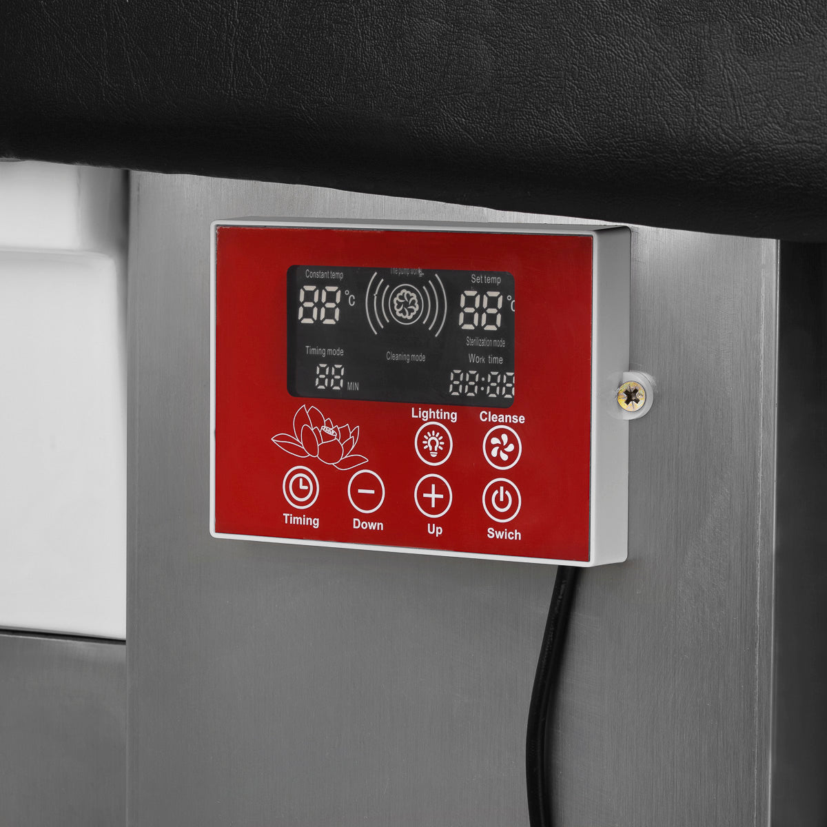 Het intuïtieve touchscreen maakt volledige controle over de behandelingsparameters mogelijk, wat zorgt voor gebruiksgemak. Hiermee kunt u de werktijd en watertemperatuur aanpassen, evenals de huidige waarden controleren. Dankzij het ingebouwde display kunt u op elk moment controleren hoe lang het apparaat al werkt. Het paneel maakt het ook mogelijk om de lichttherapiefunctie in te schakelen, d.w.z. de verlichting van de kom, waardoor een sfeer van ontspanning en luxe ontstaat. Bovendien is het stoomtherapieapparaat uitgerust met een afstandsbediening voor een comfortabele bediening op afstand.