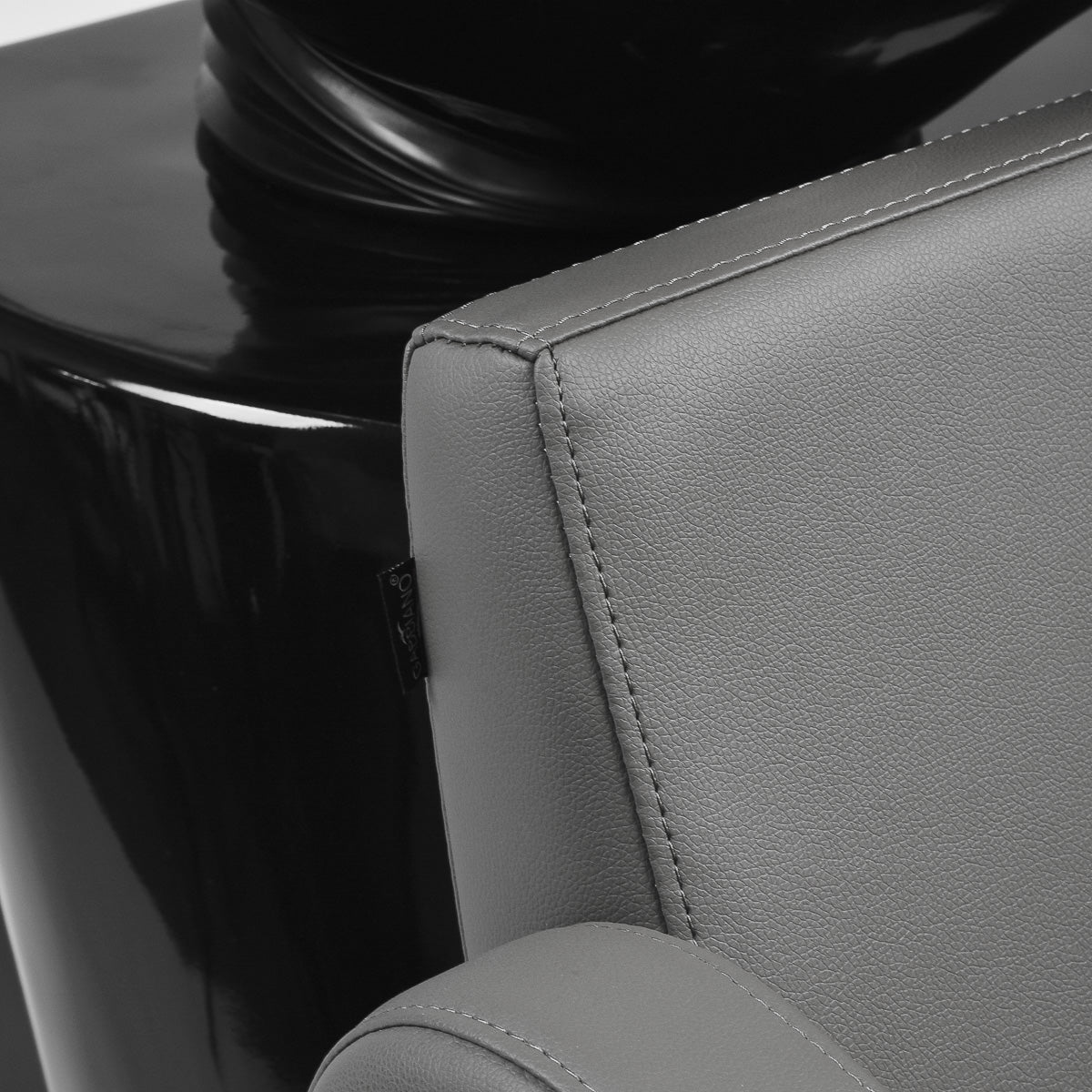 De diepe keramische kom in zwarte tinten vermindert het spatten van water en producten die tijdens behandelingen worden gebruikt. De verstelbare kanteling van de kom maakt aanpassing aan individuele behoeften mogelijk, en het gebruikte materiaal maakt de wasbak duurzaam, bestand tegen vlekken en krassen en gemakkelijk schoon te houden. De ergonomisch geprofileerde kraag biedt comfortabele hoofdsteun, terwijl de zachte zwarte plastic afdekking het gevoel van kou van het keramische oppervlak elimineert.
