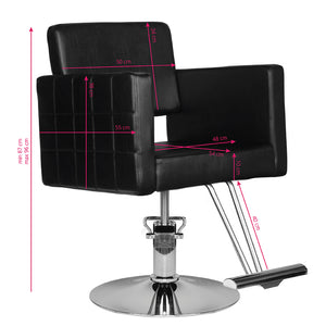 Moderne kappersstoel van het merk HAIR SYSTEM. Elegant en zeer comfortabel. De stevige, verchroomde basis garandeert de stabiliteit van de zitting. De bekleding is gemaakt van hoogwaardig zwart eco-leer. De stoel is ook in hoogte verstelbaar.