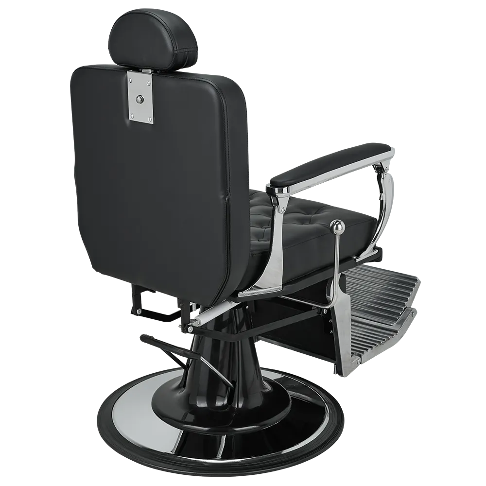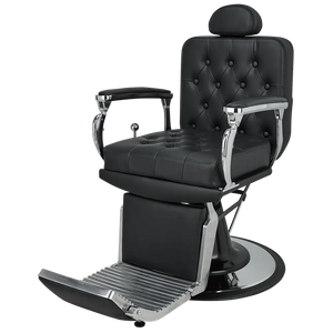 Een barbershop stoel met expressieve vormen, voorzien van een glanzend verchroomd frame en gecapitonneerde bekleding die een onderscheidend karakter toevoegen. De hendel voor het verstellen van de rugleuning roept de uitstraling op van een versnellingspook in klassieke retro-auto's.