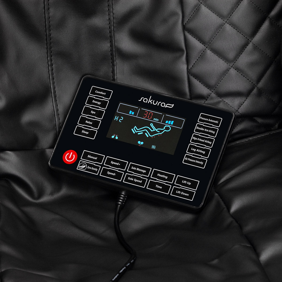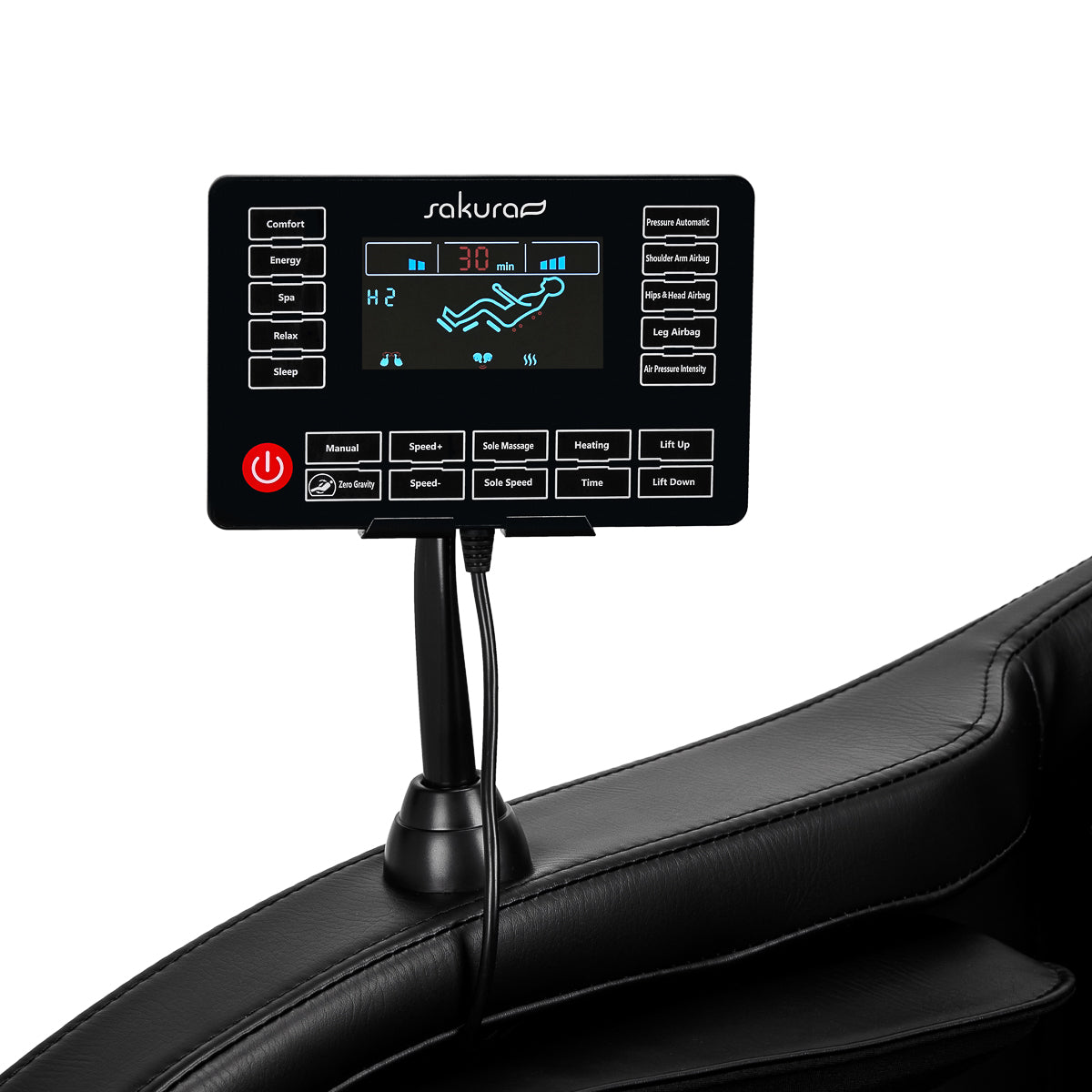 Dankzij het duidelijke bedieningspaneel – dat we op de houder op de rechterarmleuning kunnen plaatsen of in onze handen kunnen houden – is het gebruik van de stoel eenvoudig en aangenaam. Op het heldere LCD-scherm kunt u de werking van het apparaat volgen. De lichaamsdelen die op dat moment worden gemasseerd, de intensiteit, de duur van de behandeling en het geselecteerde programma worden duidelijk weergegeven. Het paneel maakt het mogelijk om de instellingen van de stoel en de massagefuncties vrij aan te passen, evenals de duur van de behandeling, die 5, 10, 15, 20, 25 of 30 minuten kan duren.