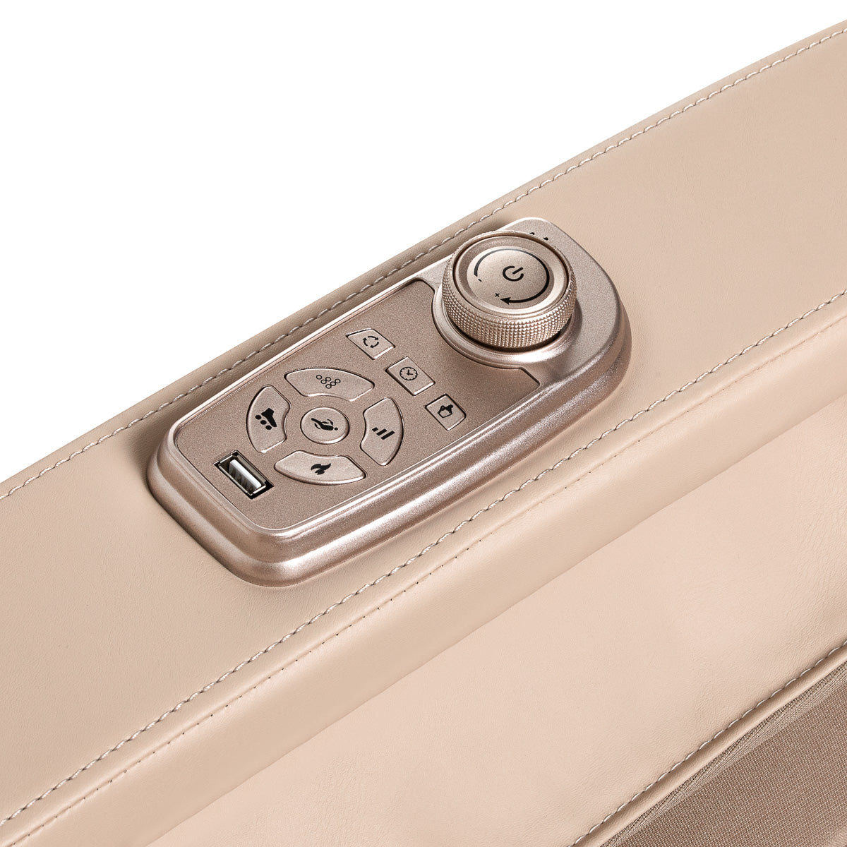 Voor nog meer gebruiksgemak is de stoel uitgerust met een set bedieningsknoppen die in de linkerarmleuning zijn ingebouwd. Met de handige afstandsbediening heeft u snel toegang tot de belangrijkste functies zonder dat u naar het hoofdpaneel hoeft te grijpen. Hiermee kunt u eenvoudig de massagemodus wijzigen, een voetmassage starten of de Zero Gravity-functie activeren - alles met het oog op maximaal comfort en zalige ontspanning. Bovendien is hij uitgerust met een USB-poort, zodat u uw telefoon tijdens de massage kunt opladen.