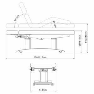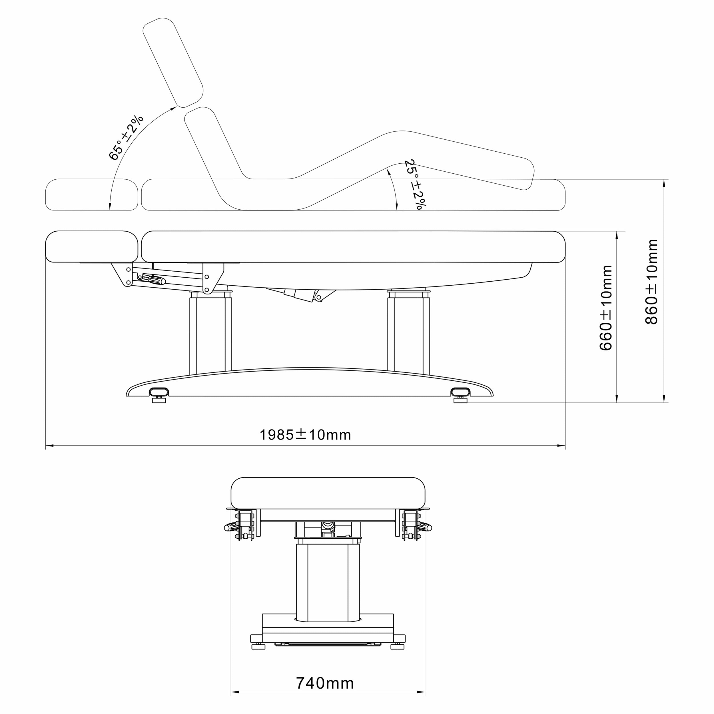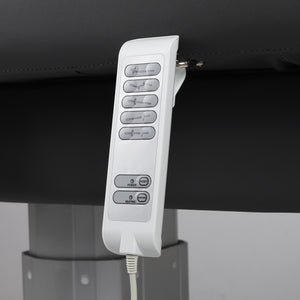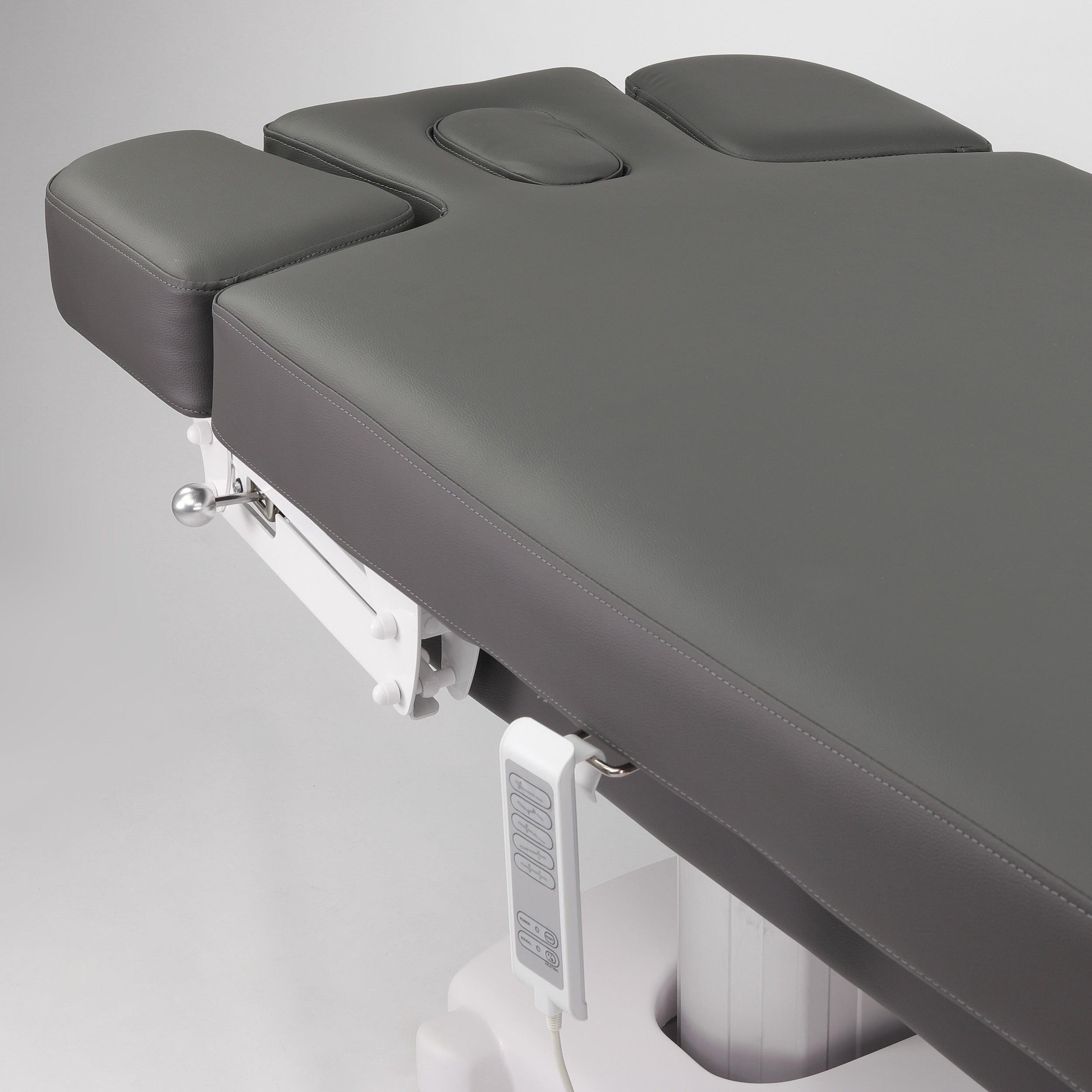 4 duurzame motoren en elektrische verstelling via een handbediening stellen u in staat om de hoogte van het tafelblad en de hellingshoeken van de hoofdsteun en voetensteun te positioneren.