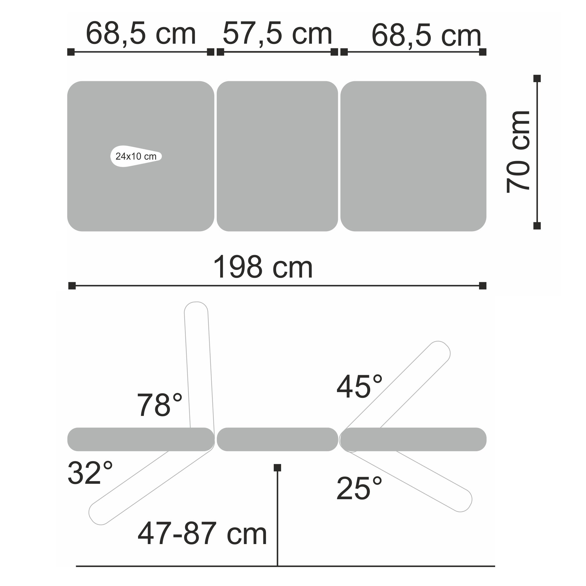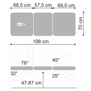 Driedelig blad: ontworpen voor universele toepassing, het blad meet 198 x 70 cm, met verstelling van de been- en hoofdsteunsecties, waardoor de positie van de patiënt kan worden aangepast aan verschillende therapeutische procedures.