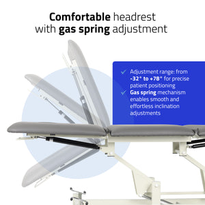 Verstelbare hoofdsteun: de mogelijkheid om de hellingshoek aan te passen met behulp van een gasveer van -32° tot +78° maakt een nauwkeurige aanpassing van de positie van de patiënt aan de eisen van een bepaalde therapie mogelijk.