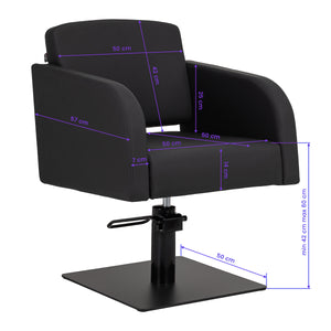 Gabbiano Elda frisørstolen kombinerer minimalistisk design med funktionalitet og daglig komfort. Strømlinede linjer giver den en let og moderne karakter, mens den stabile, firkantede base i mat sort yderligere understreger dens stil. Den bløde skumfyldning kombineret med blødt syntetisk læder i sorte nuancer sikrer komfort selv under lange behandlinger. Nøje udvalgte materialer sikrer holdbarhed, fugtbestandighed og nem rengøring. Stolen passer perfekt ind i både moderne og klassiske interiører og understreger salonens professionelle karakter.