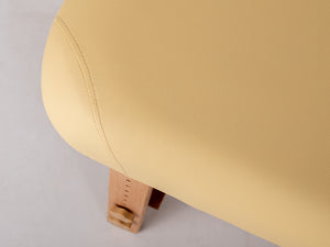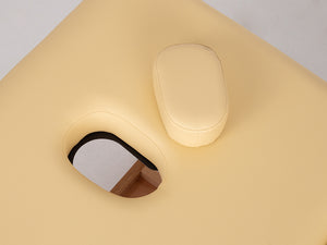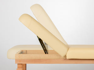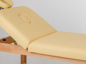 Den dobbelt-knækkende bordplade gør det muligt at placere patienten i den mest komfortable position, afhængigt af den type behandling, der udføres. Sengen, fyldt med 6 cm skum og dækket med behageligt betræk, giver patienten fuld komfort og tillader fri kropspositionering. Den funktionelle hylde under sengen giver ekstra plads til tilbehør og kosmetik, der er nødvendigt under behandlingen. De naturlige træbaseelementer tilføjer stor æstetisk værdi til briksen.