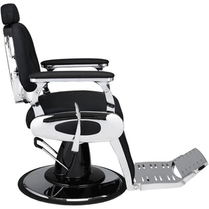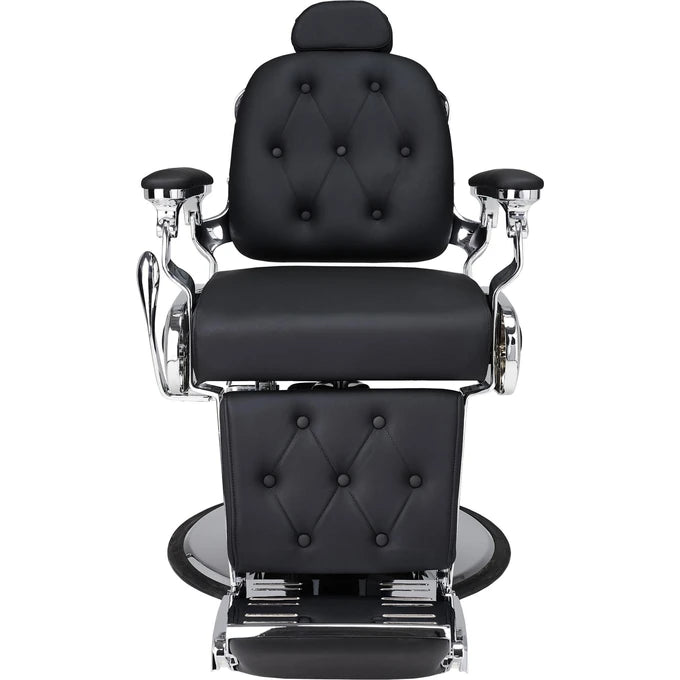 It can easily become the centerpiece of any hair salon. The very essence of a traditional Barber Shop. Fully reclining, featuring a swivel footrest and plenty of chrome details. Its distinguishing features are the button-tufted backrest and the upholstered insert on the seat casing. Black upholstery