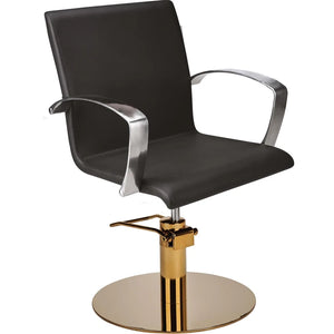 The PARTNER barber chair is a piece of furniture with a truly classic design. Its simple seat shape combined with elegantly curved silver aluminium armrests creates a refined and timeless look. Black upholstery