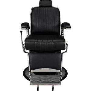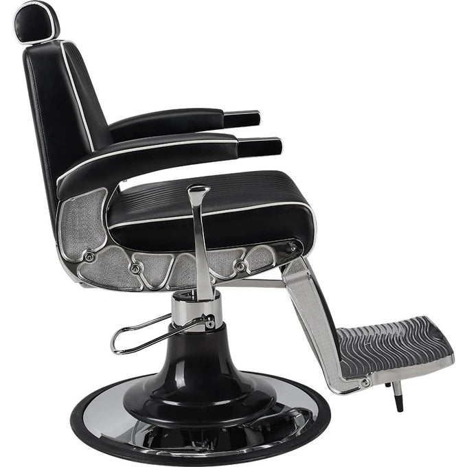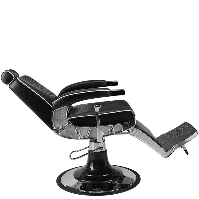 A model for lovers of classic elegance in the barbershop. It features a chrome frame with decorative sides, vertical stitching on the backrest and seat, and is finished with elegant white trimming. Black upholstery with vertical stitching