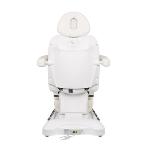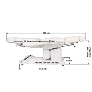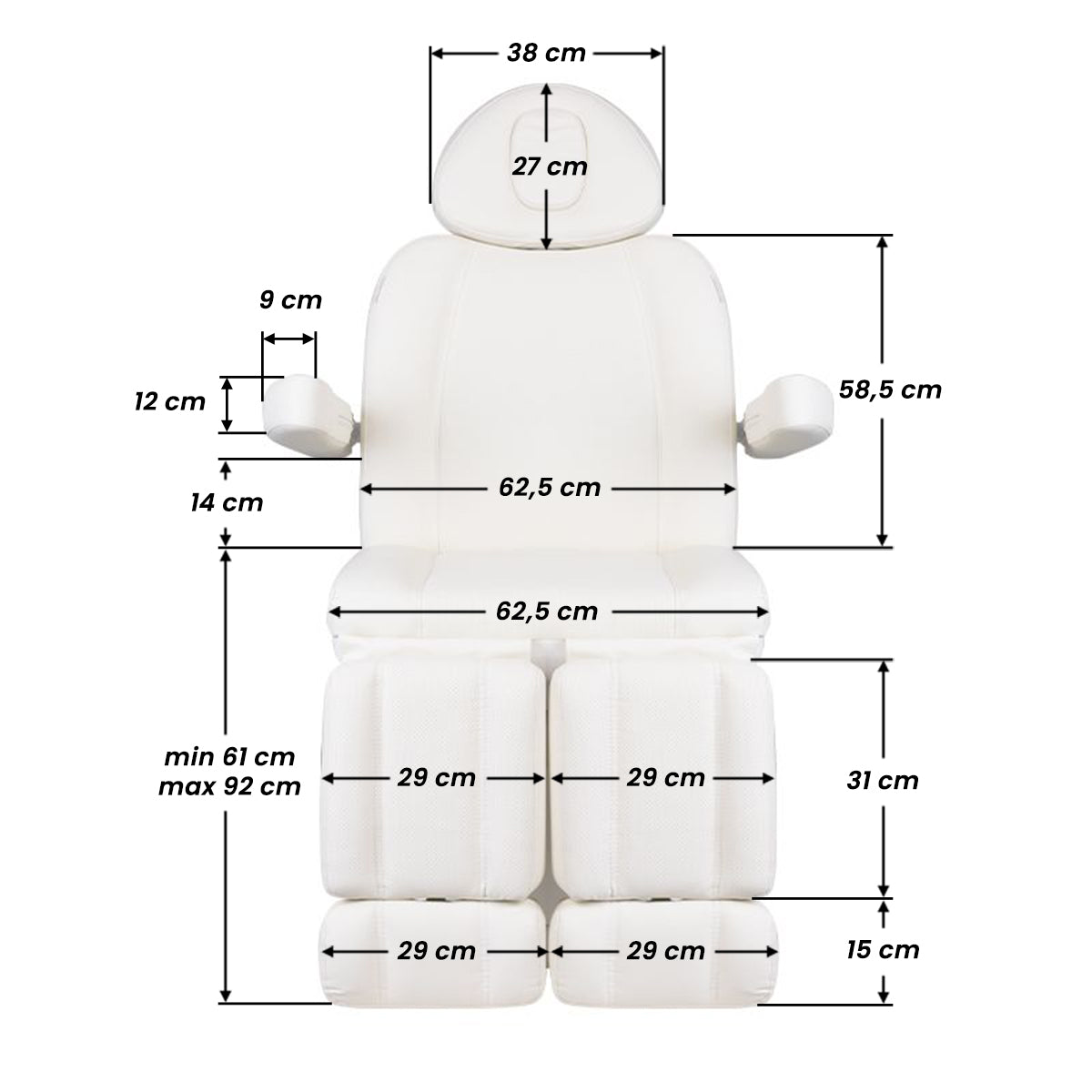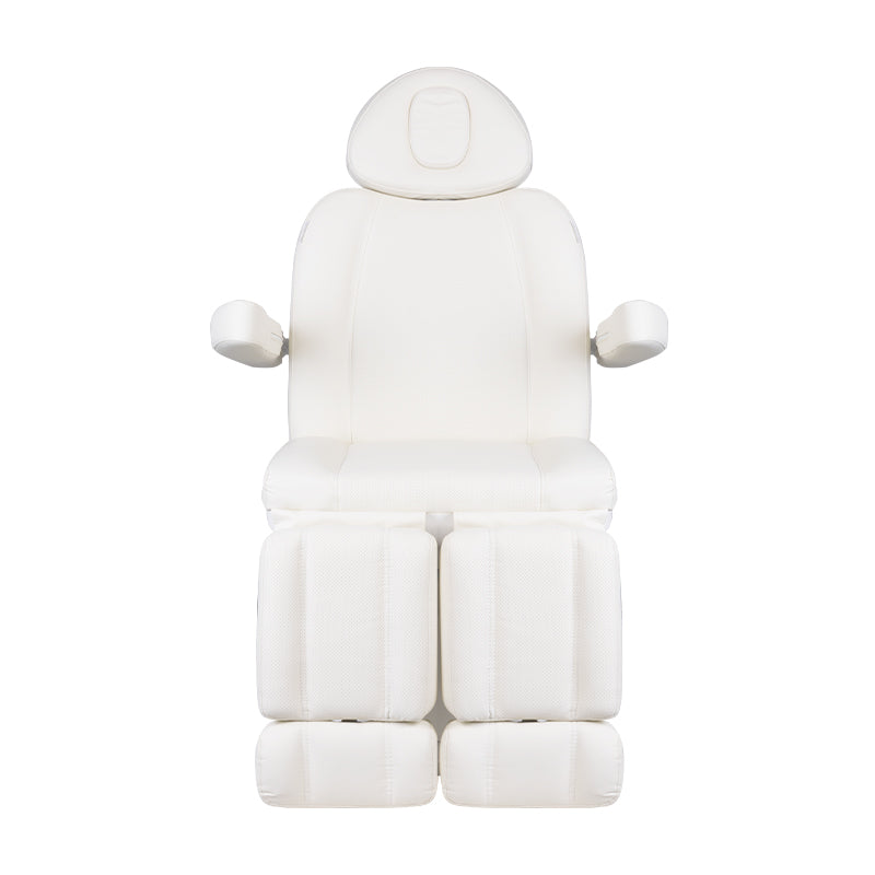 Een unieke elektrische cosmetische stoel, ideaal voor schoonheidssalons en SPA-salons. Dankzij de onafhankelijke actuatoren kunt u de stoel in 3 vlakken verstellen vlakken met behulp van de afstandsbediening en voetschakelaars , waardoor u comfortabel pedicurebehandelingen en gezichts- en lichaamsbehandelingen kunt uitvoeren. Met de afstandsbediening kunnen we de geprogrammeerde instellingen gebruiken en de HOT-functie, d.w.z. verwarming, activeren. De stoel is voorzien van geperforeerde bekleding die in andere stoelen niet voorkomt, en een kleurrijke LED-achtergrondverlichting van de basis.
