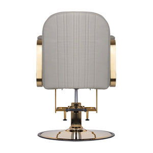 Zeer comfortabel, perfect passend in het interieur van elegante salons. Verticaal verstelbaar. Zeer stabiel en solide. Bekleding van de hoogste kwaliteit eco-leer in de kleur beige. De gouden afwerking van de metalen elementen completeert de elegantie van deze stoel.