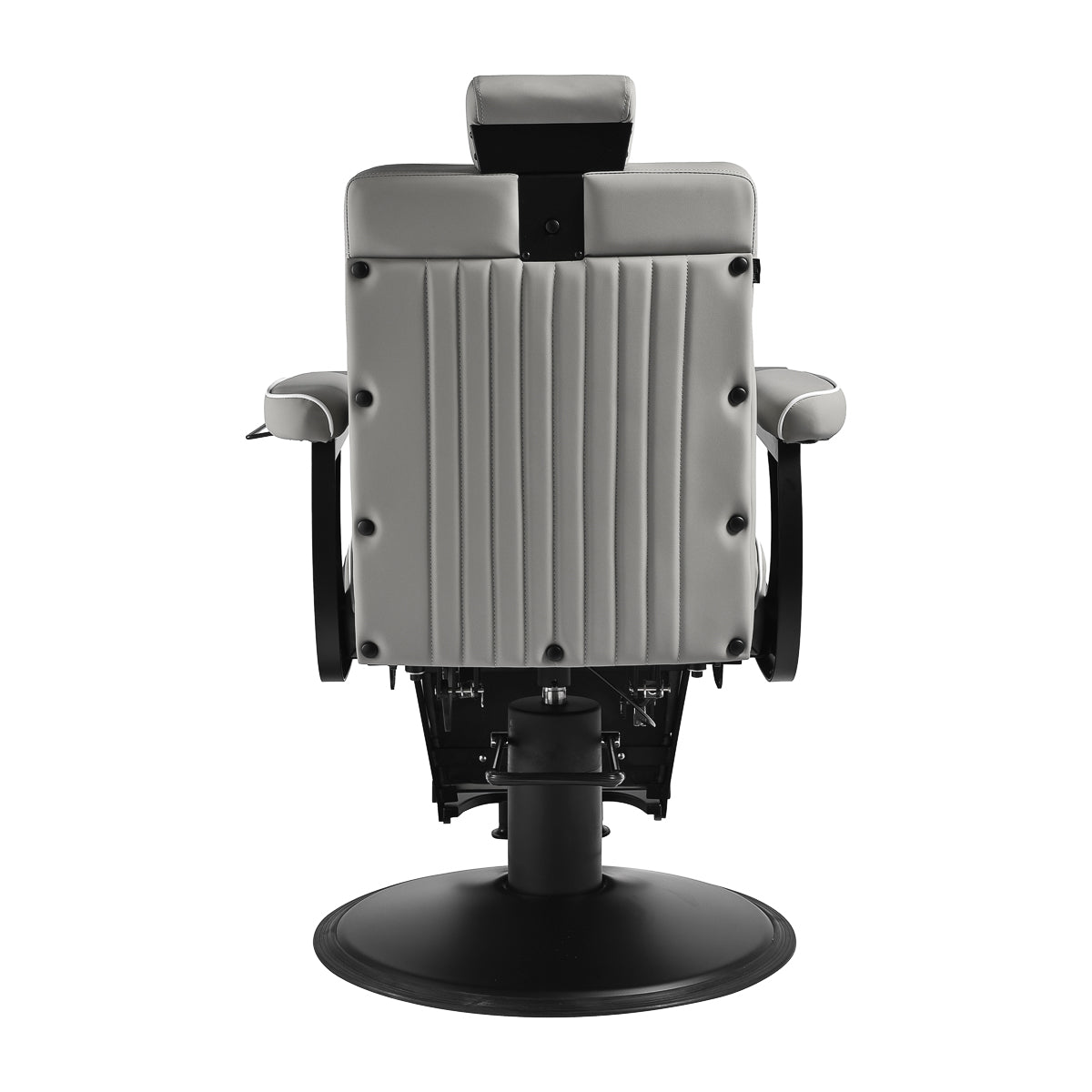 The black, round base ensures stability and durability. The soft, matte synthetic leather upholstery combines comfort with durability. The materials used are moisture-resistant, durable and easy to clean. Stylish stitching and grey-toned upholstery give it a unique character, perfectly complementing the décor of modern barbershops. The combination of the elegant upholstery colour with the black frame and base emphasises the modern, professional look of the chair.