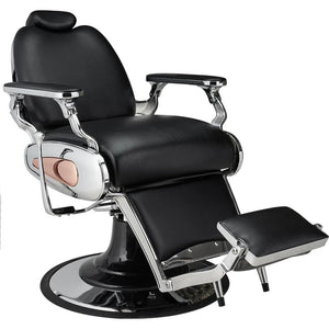 Een barbershop-klassieker met een verchroomd frame en koperen details aan de zijkanten van de zitting. Gladde zwarte bekleding en een gestoffeerde draaibare voetsteun bieden extra comfort, terwijl de zwarte pompkap de elegante look compleet maakt.